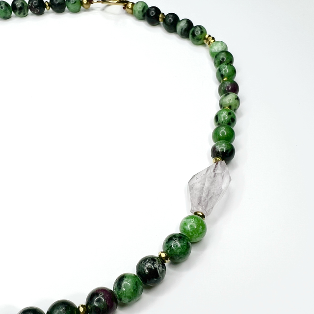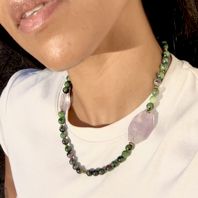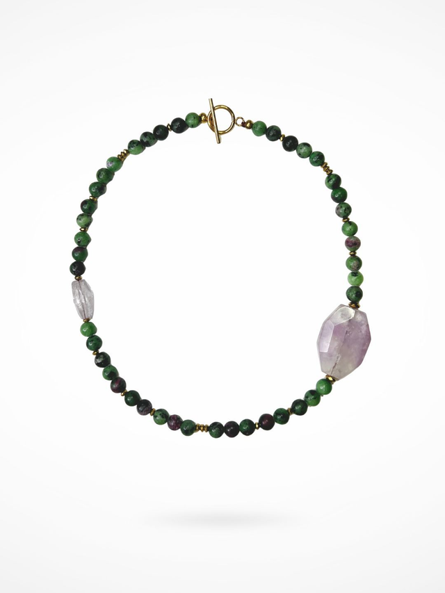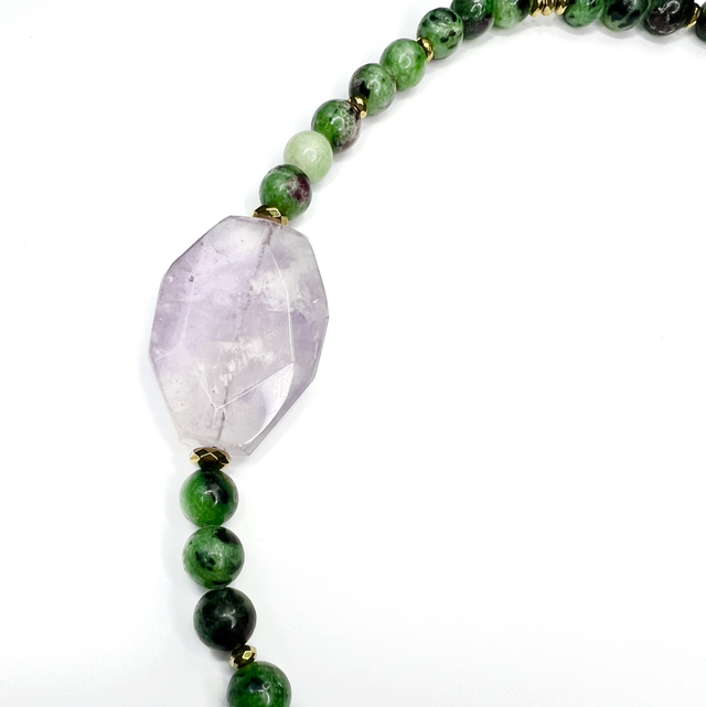 Matériaux : perles de rubis zoïsite, hématite, améthyste.