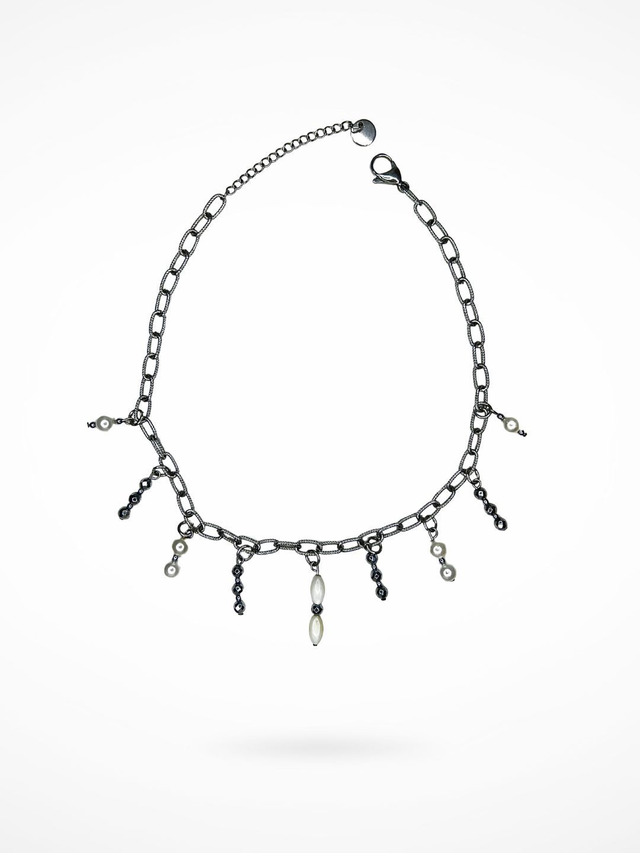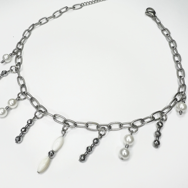 Matériaux : hématite, perles d’eau douce, acier inoxydable