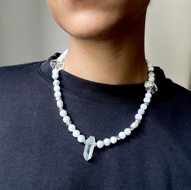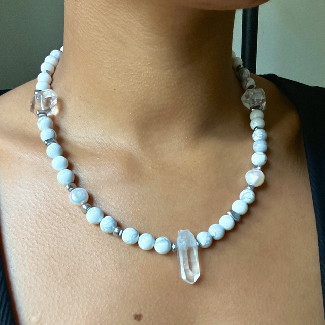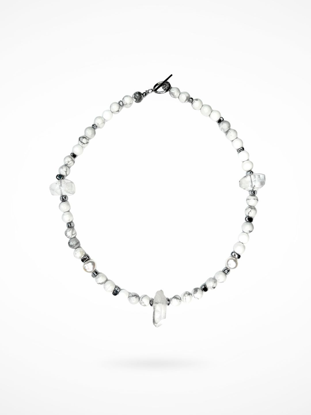 Matériaux : perles de howlite, hématite, cristal de roche, deux perles d’eau douce