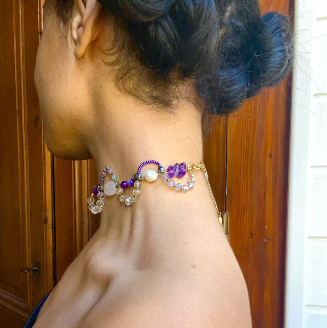 L’assemblage mêle des perles de fluorine multicolore à des pierres aux énergies douces mais structurantes : améthyste, cristal de roche, quartz rose, agate violette et perles d’eau douce. L’hématite vient ancrer l’ensemble, apportant contraste et profondeur à cette palette lumineuse.