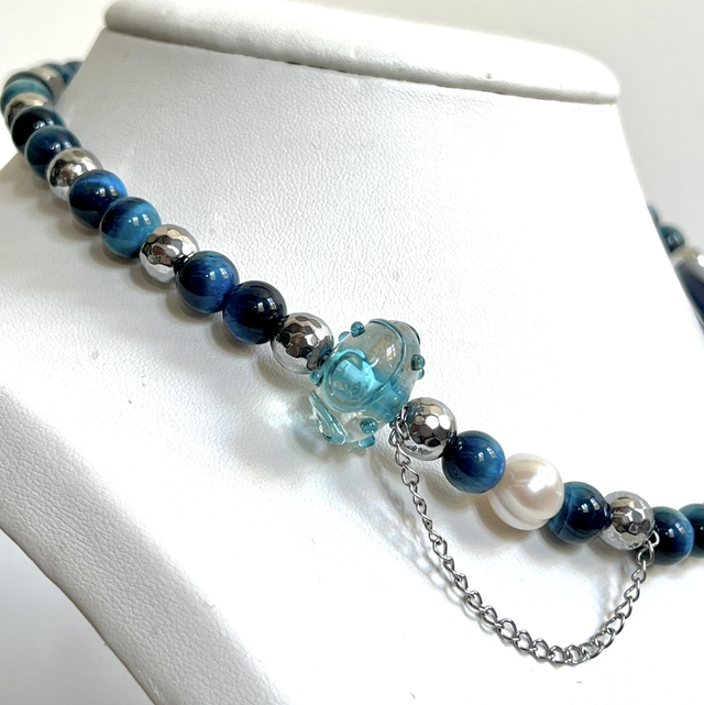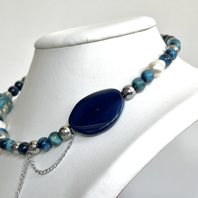 Un élégant assemblage d'oeil de tigre teinté, d'hématite et de perles d'eau douce.