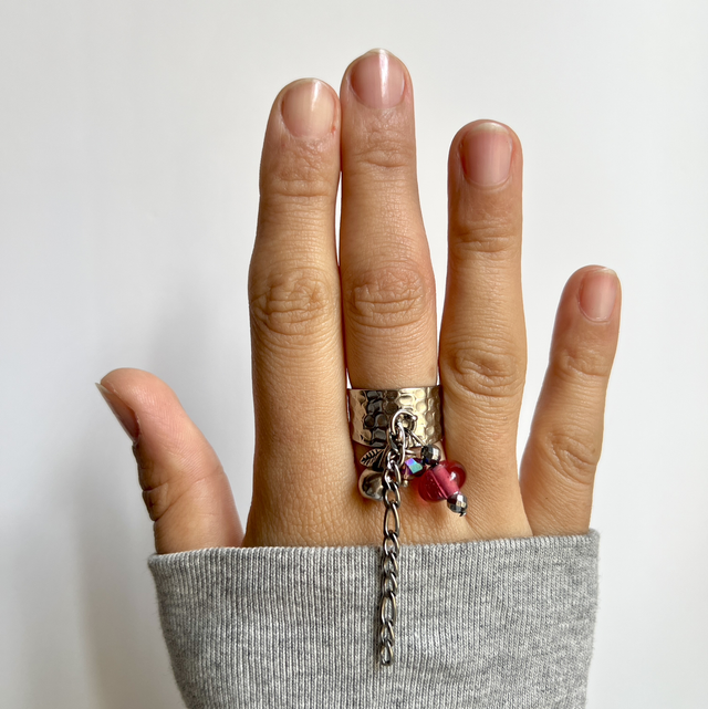 Chaque élément est libre de bouger, de s’entrechoquer, de vivre : la bague capte la lumière, accompagne les gestes et émet un léger tintement presque imperceptible, comme un bijou vivant.