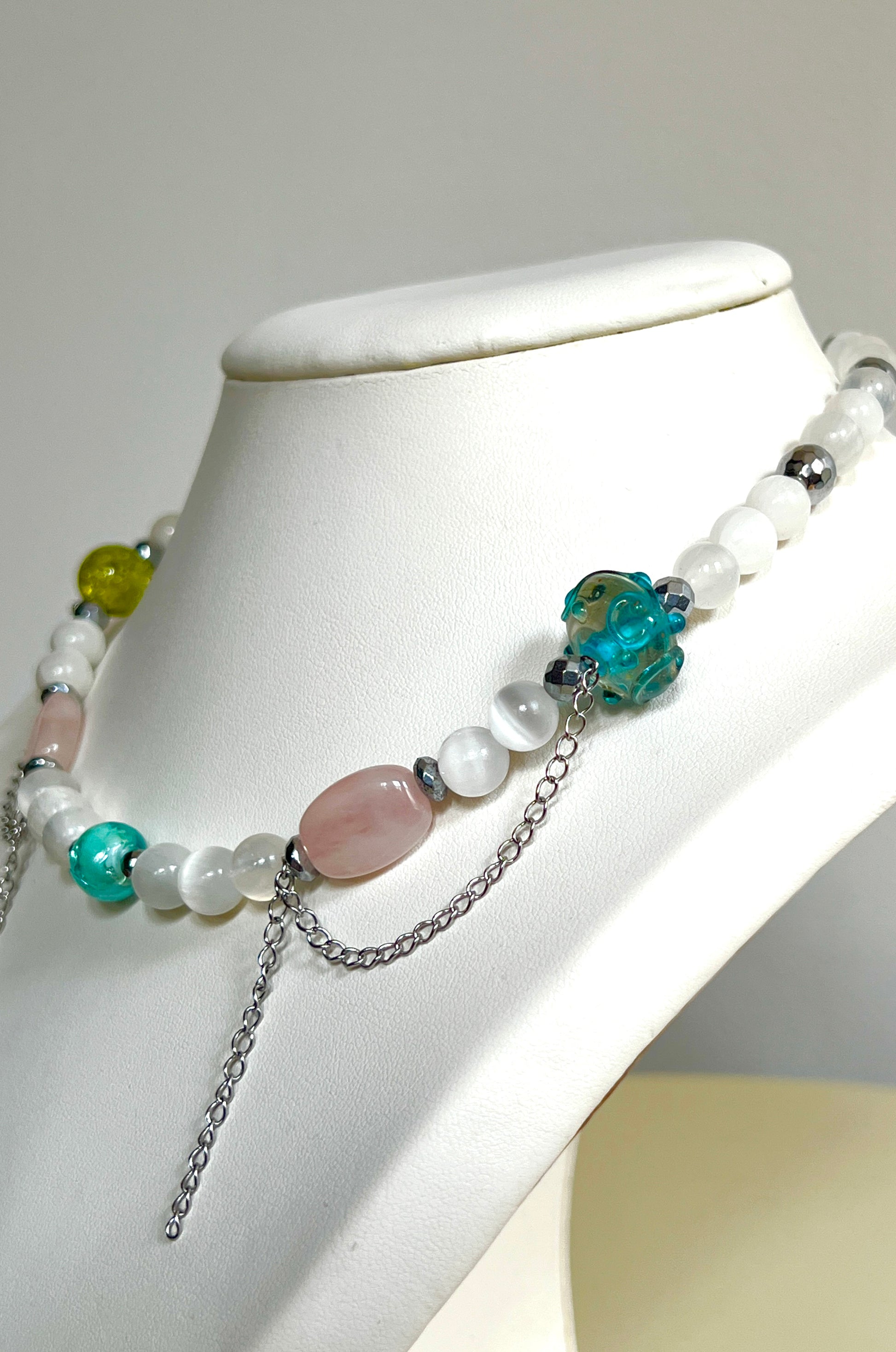 Le quartz rose insuffle douceur et chaleur, tandis que les perles de verre bleues et vert acidulé viennent ponctuer l’ensemble d’une touche vive et lumineuse. Des chaînes tombantes en acier inoxydable viennent rompre la linéarité et apportent mouvement et sensualité.